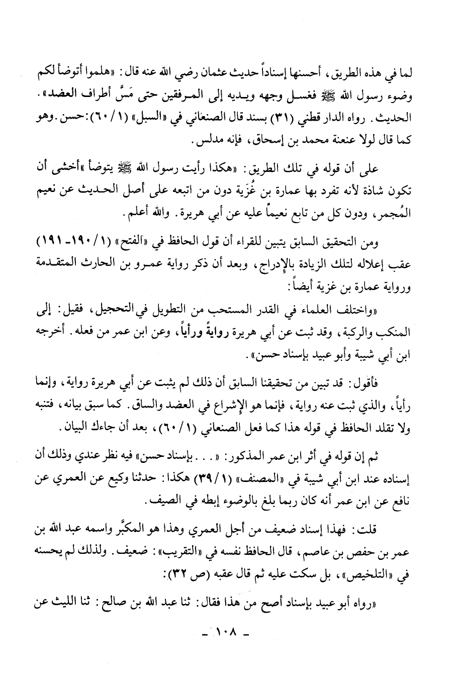 فأقول: قد تبين من تحقيقنا السابق أن ذلك لم يثبت عن أبي هريرة رواية، وإنما رأيا، والذي ثبت عنه رواية، فإنما هو الإشراع في العضد والساق، كما سبق بيانه، فتنبه ولا تقلد الحافظ في قوله هذا كما فعل الصنعاني (1/60) ، بعد أن جاءك البيان.