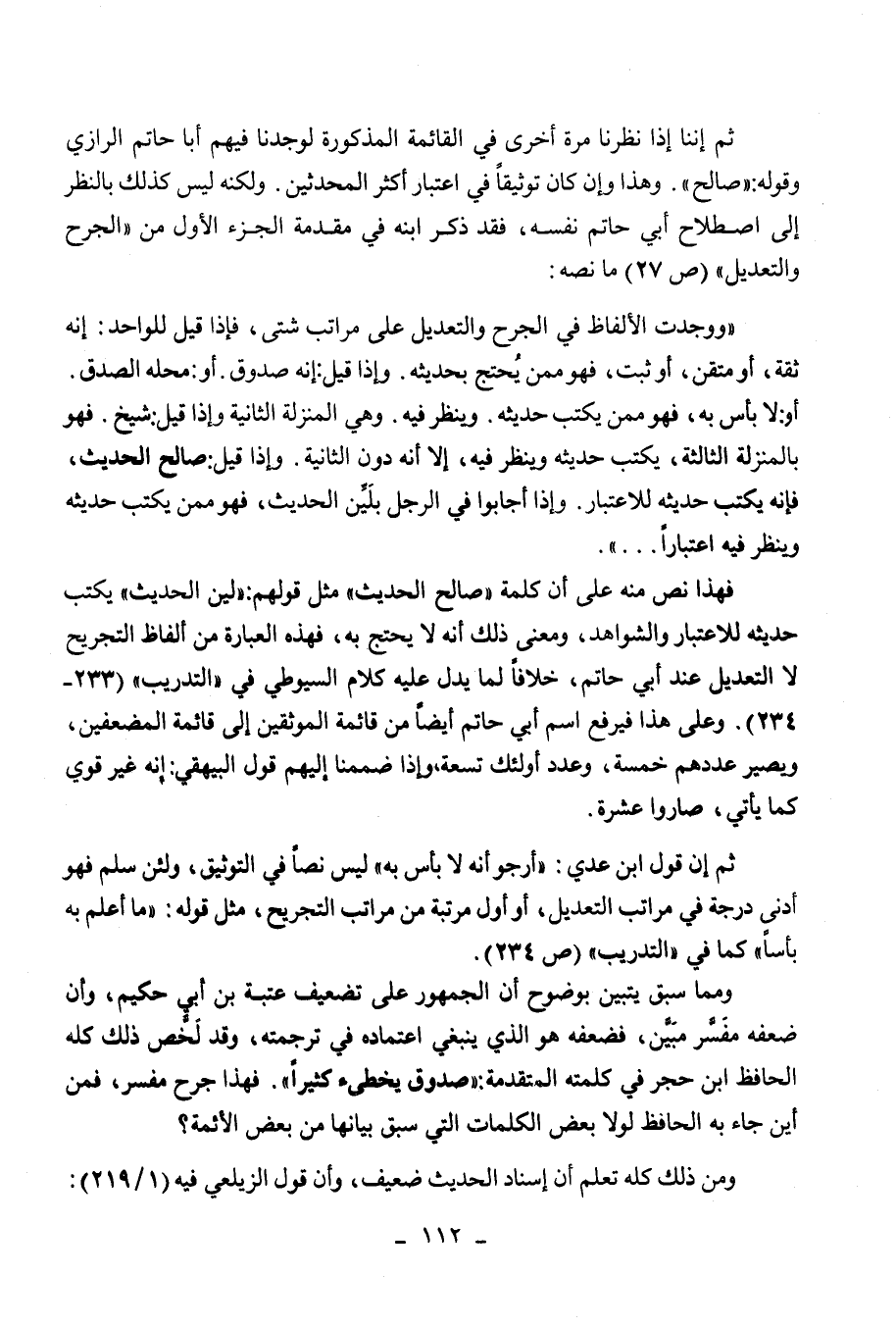 فهذا نص منه على أن كلمة صالح الحديث مثل قولهم: لين الحديث يكتب حديثه للاعتبار والشواهد، ومعنى ذلك أنه لا يحتج به، فهذه العبارة من ألفاظ التجريح لا التعديل عند أبي حاتم، خلافا لما يدل عليه كلام السيوطي في " التدريب " (233 - 234) ، وعلى هذا فيرفع اسم أبي حاتم أيضا من قائمة الموثقين إلى قائمة المضعفين، ويصير عددهم خمسة، وعدد أولئك تسعة، وإذا ضممنا إليهم قول البيهقي: إنه غير قوي كما يأتي، صاروا عشرة.