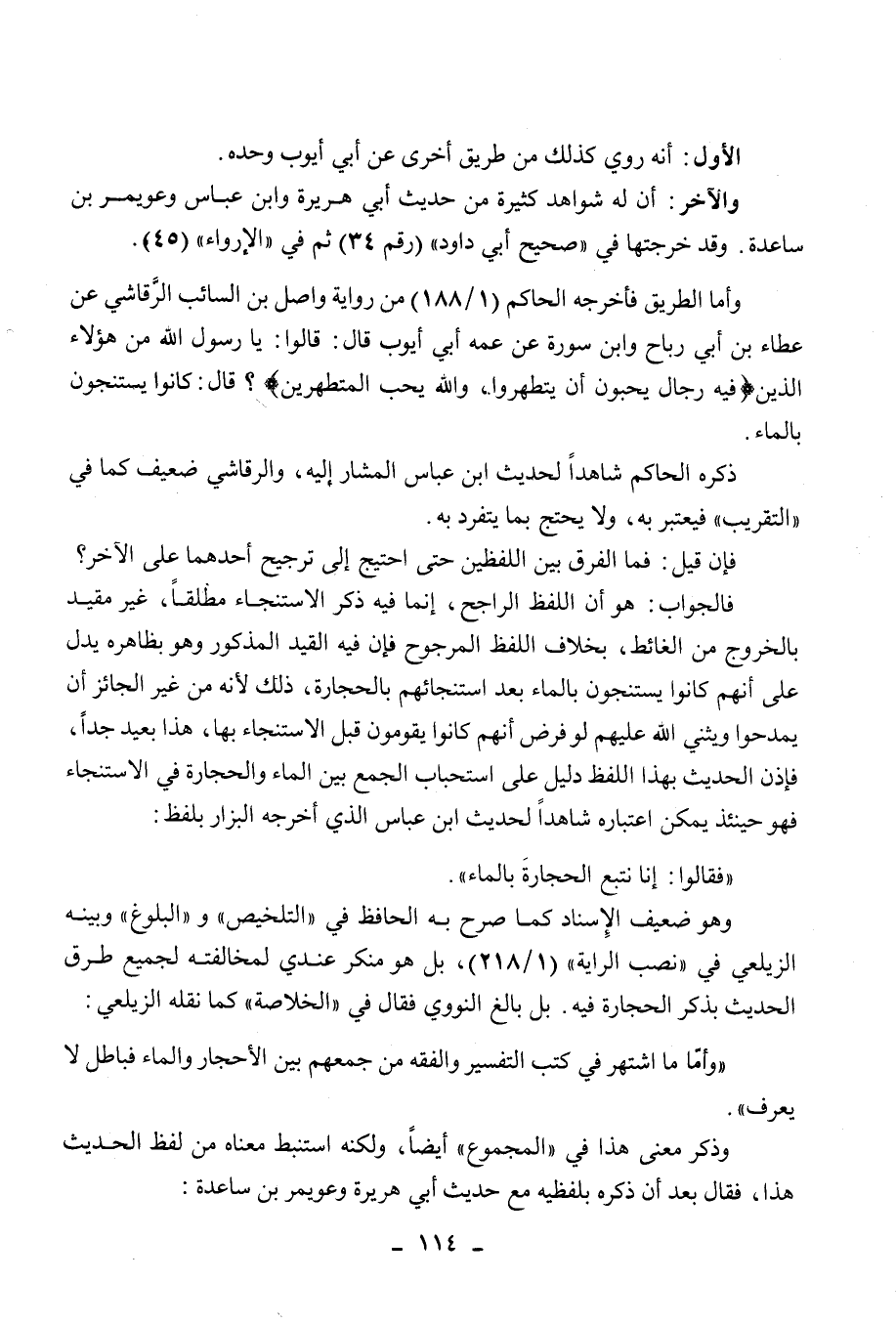 وأما الطريق فأخرجه الحاكم (1/188) من رواية واصل بن السائب الرقاشي عن عطاء ابن أبي رباح وابن سورة عن عمه أبي أيوب قال: قالوا: يا رسول الله من هؤلاء الذين " فيه رجال يحبون أن يتطهروا، والله يحب المتطهرين "؟ قال: كانوا يستنجون بالماء.