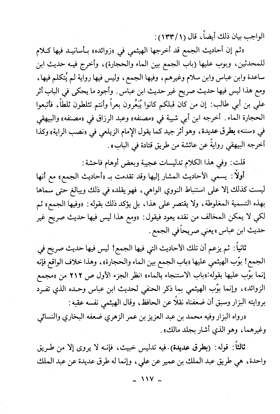 بوب الهيثمي عليها " باب الجمع بين الماء والحجارة "، وهذا خلاف الواقع فإنه إنما بوب عليها بقوله: " باب الاستنجاء بالماء " انظر الجزء الأول ص 212 من " مجمع الزوائد "، وإنما بوب الهيثمي بما ذكر الحنفي لحديث ابن عباس وحده الذي تفرد بروايته البزار وسبق أن ضعفناه نقلا عن الحافظ، وقال الهيثمي نفسه عقبه: