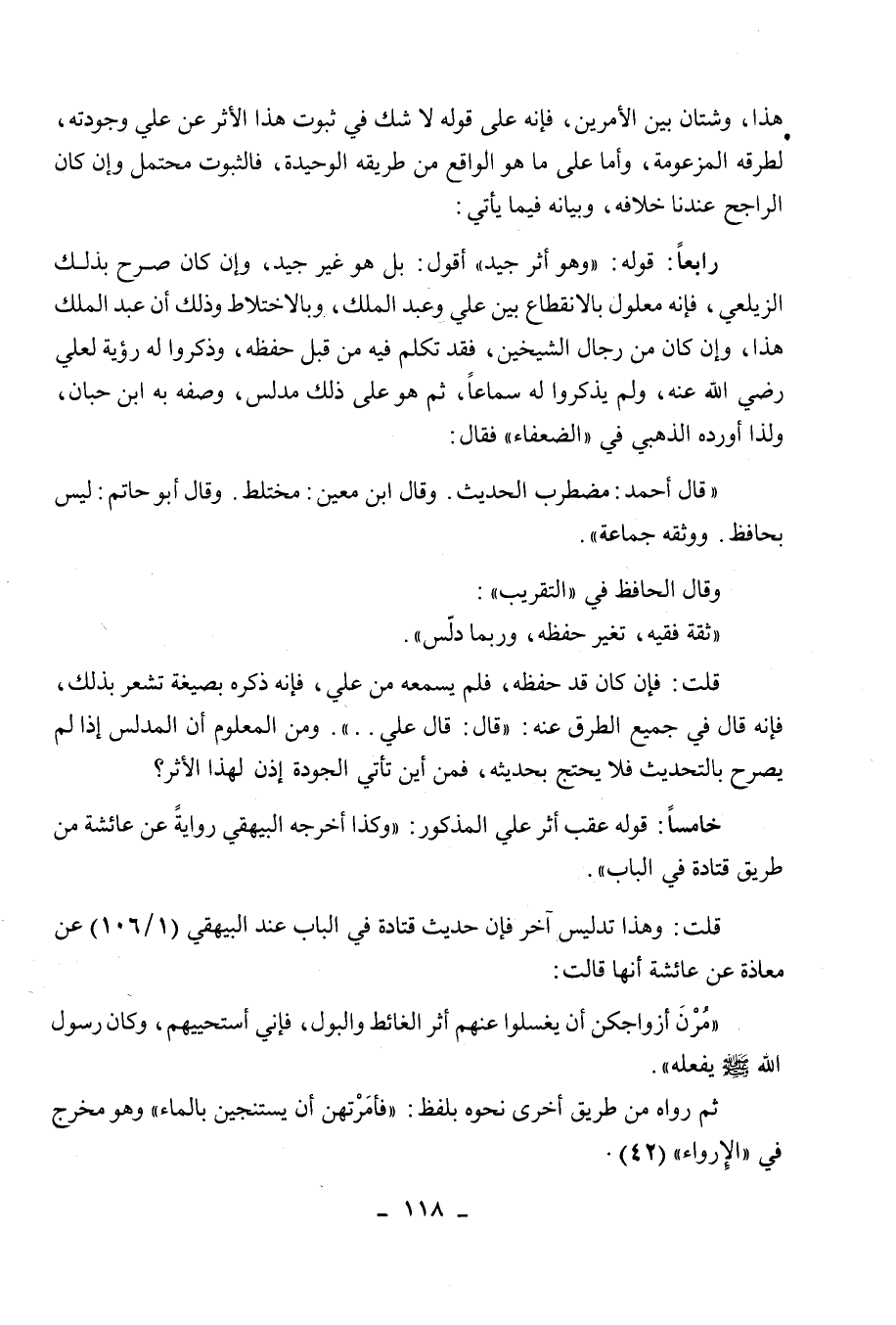 قلت: فإن كان قد حفظه، فلم يسمعه من علي، فإنه ذكره بصيغة تشعر بذلك، فإنه قال في جميع الطرق عنه: قال: قال علي..، ومن المعلوم أن المدلس إذا لم يصرح بالتحديث فلا يحتج بحديثه، فمن أين تأتي الجودة إذن لهذا الأثر؟