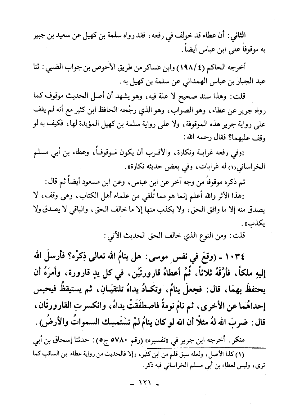 1034 - " وقع في نفس موسى: هل ينام الله تعالى ذكره؟ فأرسل الله إليه ملكا، فأرقه ثلاثا، ثم أعطاه قارورتين، في كل يد قارورة، وأمره أن يحتفظ بهما، قال: فجعل ينام، وتكاد يداه تلتقيان، ثم يستيقظ فيحبس إحداهما عن الأخرى، ثم نام نومة فاصطفقت يداه، وانكسرت القارورتان، قال: ضرب الله مثلا أن الله لوكان ينام لم تستمسك السموات والأرض ".