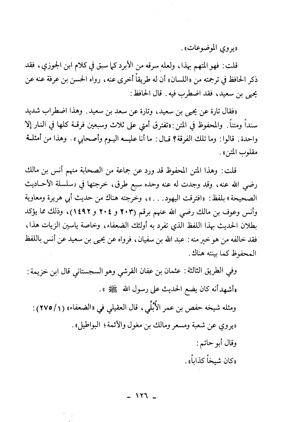 قلت: وهذا المتن المحفوظ قد ورد عن جماعة من الصحابة منهم أنس بن مالك رضي الله عنه، وقد وجدت له عنه وحده سبع طرق، خرجتها في " سلسلة الأحاديث الصحيحة " بلفظ: " افترقت اليهود ... "، وخرجته هناك من حديث أبي هريرة ومعاوية وأنس وعوف بن مالك رضي الله عنهم برقم (203 و204 و1492) ، وذلك مما يؤكد بطلان الحديث بهذا اللفظ الذي تفرد به أولئك الضعفاء، وخاصة ياسين الزيات هذا، فقد خالفه من هو خير منه: عبد الله بن سفيان، فرواه عن يحيى بن سعيد عن أنس باللفظ المحفوظ كما بينته هناك.