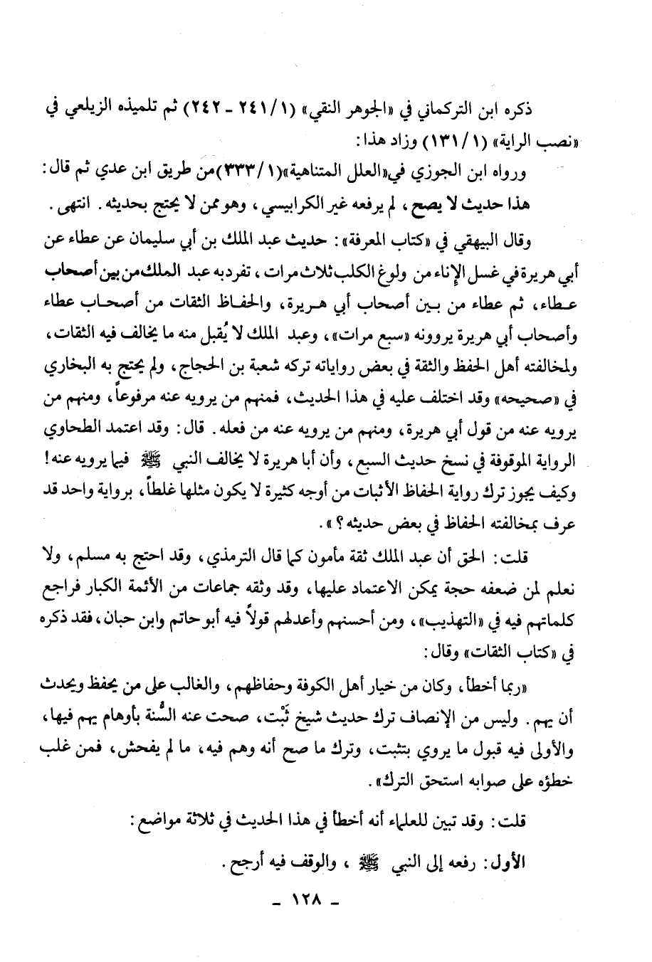 وقال البيهقي في " كتاب المعرفة ": حديث عبد الملك بن أبي سليمان عن عطاء عن أبي هريرة في غسل الإناء من ولوغ الكلب ثلاث مرات، تفرد به عبد الملك من بين أصحاب عطاء، ثم عطاء من بين أصحاب أبي هريرة، والحفاظ الثقات من أصحاب عطاء وأصحاب أبي هريرة يروونه " سبع مرات "، وعبد الملك لا يقبل منه ما يخالف فيه الثقات، ولمخالفته أهل الحفظ والثقة في بعض رواياته تركه شعبة بن الحجاج، ولم يحتج به البخاري في " صحيحه " وقد اختلف عليه في هذا الحديث، فمنهم من يرويه عنه مرفوعا، ومنهم من يرويه عنه من قول أبي هريرة، ومنهم من يرويه عنه من فعله، قال: وقد اعتمد الطحاوي الرواية الموقوفة في نسخ حديث السبع، وأن أبا هريرة لا يخالف النبي صلى الله عليه وسلم فيما يرويه عنه! وكيف يجوز ترك رواية الحفاظ الأثبات من أوجه كثيرة لا يكون مثلها غلطا، برواية واحد قد عرف بمخالفته الحفاظ في بعض حديثه؟.