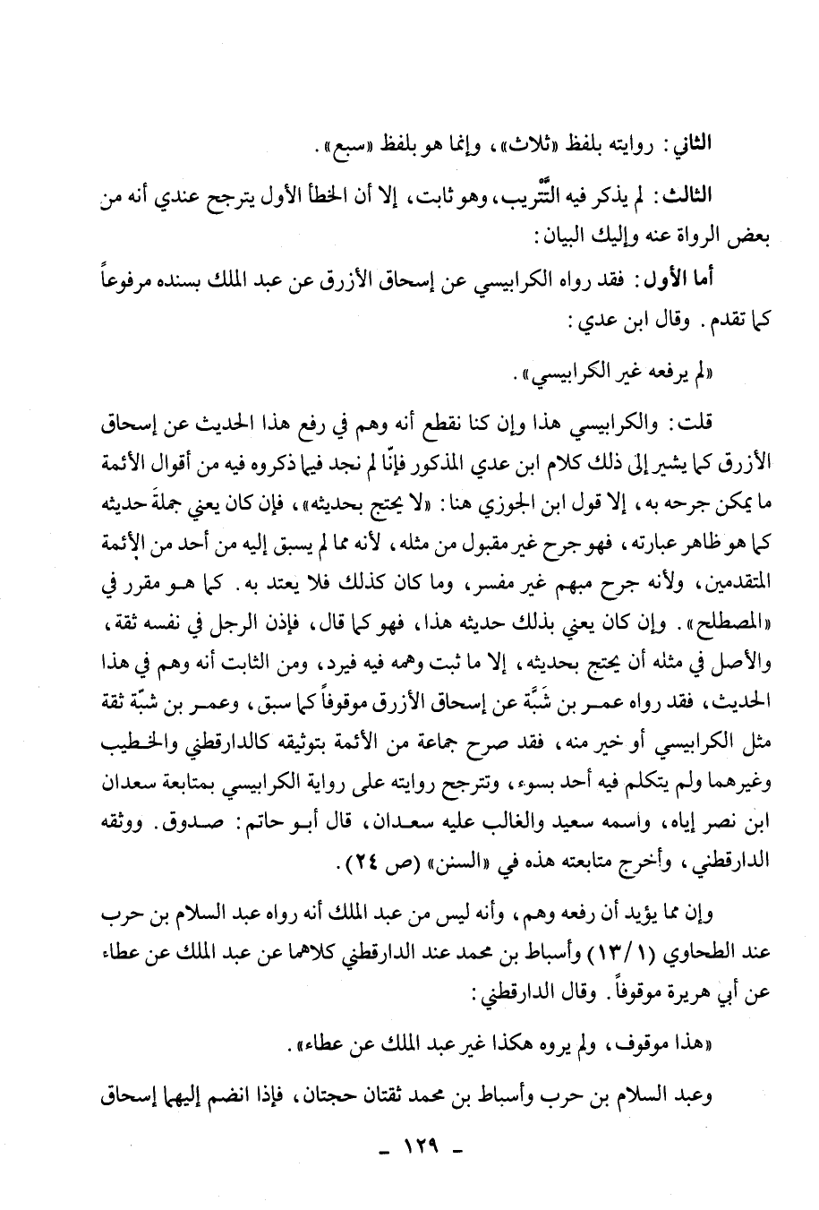 وإن مما يؤيد أن رفعه وهم، وأنه ليس من عبد الملك أنه رواه عبد السلام بن حرب عند الطحاوي (1/13) وأسباط بن محمد عند الدارقطني كلاهما عن عبد الملك عن عطاء عن أبي هريرة موقوفا، وقال الدارقطني: