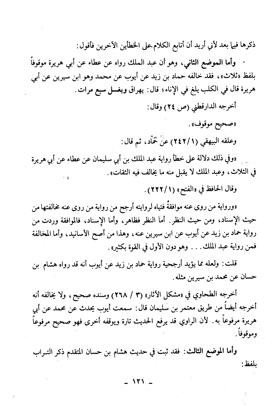 وأما الموضع الثاني، وهو أن عبد الملك رواه عن عطاء عن أبي هريرة موقوفا بلفظ " ثلاث "، فقد خالفه حماد بن زيد عن أيوب عن محمد وهو ابن سيرين عن أبي هريرة قال في الكلب يلغ في الإناء؛ قال: يهراق ويغسل سبع مرات.