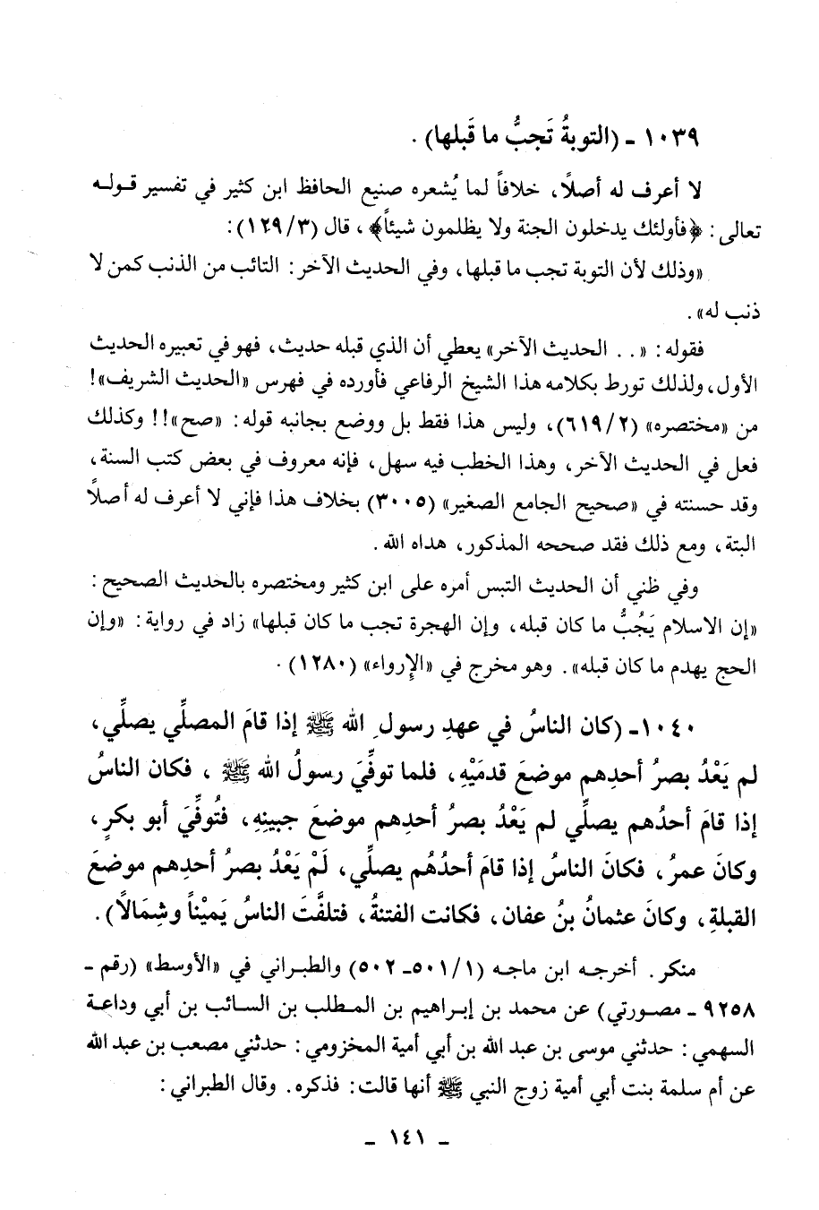 وفي ظني أن الحديث التبس أمره على ابن كثير ومختصره بالحديث الصحيح: " إن الإسلام يجب ما كان قبله، وإن الهجرة تجب ما كان قبلها " زاد في رواية: