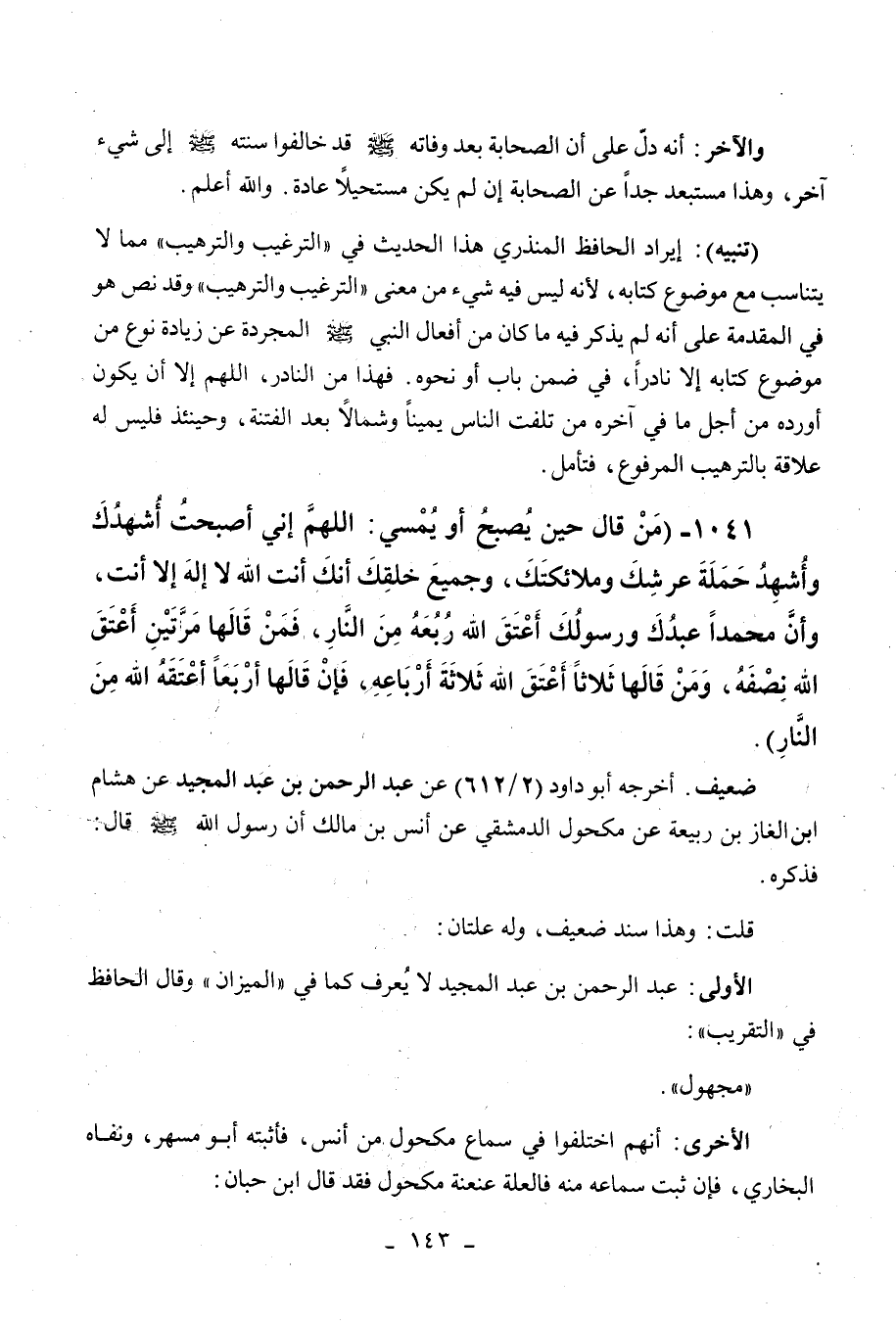 الأولى: عبد الرحمن بن عبد المجيد لا يعرف كما في " الميزان " وقال الحافظ في " التقريب ": مجهول.