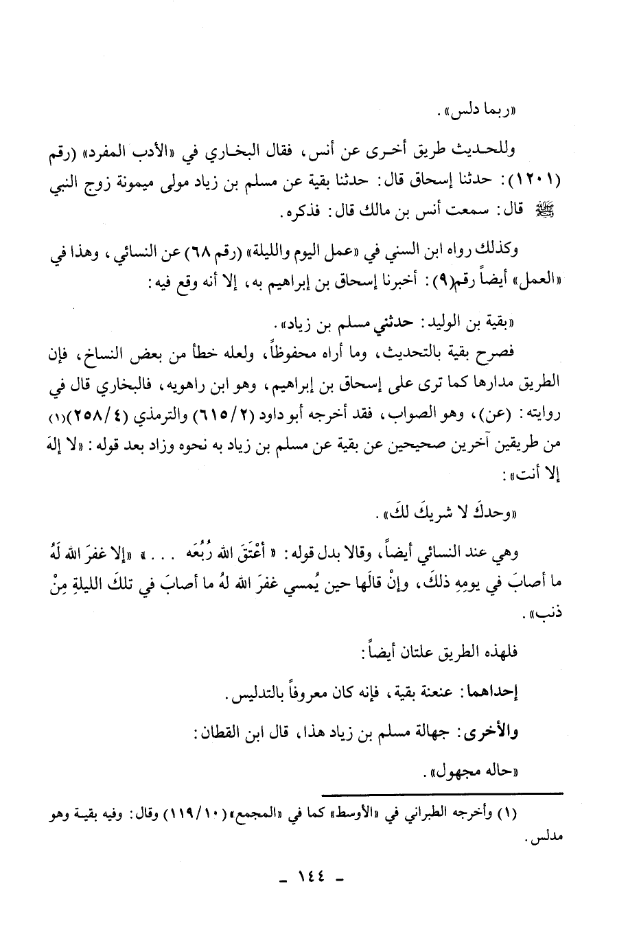 فصرح بقية بالتحديث، وما أراه محفوظا، ولعله خطأ من بعض النساخ، فإن الطريق مدارها كما ترى على إسحاق بن إبراهيم، وهو ابن راهويه، فالبخاري قال في روايته: (عن) ، وهو الصواب، فقد أخرجه أبو داود (2/615) والترمذي (4/258) (1) من طريقين آخرين صحيحين عن بقية عن مسلم بن زياد به نحوه وزاد بعد قوله: " لا إله إلا أنت وحدك لا شريك لك ".
