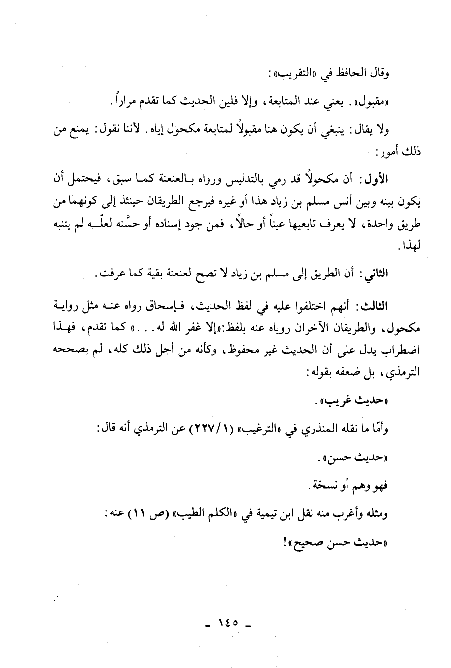 الثالث: أنهم اختلفوا عليه في لفظ الحديث، فإسحاق رواه عنه مثل رواية مكحول، والطريقان الآخران روياه عنه بلفظ: " إلا غفر الله له ... " كما تقدم، فهذا اضطراب يدل على أن الحديث غير محفوظ، وكأنه من أجل ذلك كله، لم يصححه الترمذي، بل ضعفه بقوله: حديث غريب.
