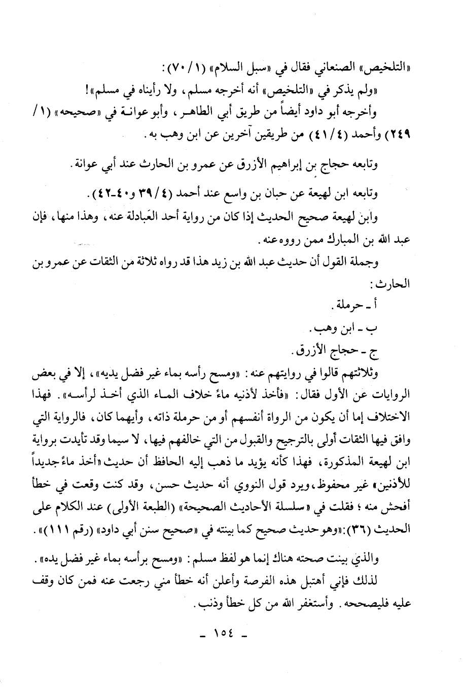 الحافظ أن حديث " أخذ ماء جديدا للأذنين " غير محفوظ، ويرد قول النووي أنه حديث حسن، وقد كنت وقعت في خطأ أفحش منه؛ فقلت في " سلسلة الأحاديث الصحيحة " (الطبعة الأولى) عند الكلام على الحديث (36) : وهو حديث صحيح كما بينته في " صحيح سنن أبي داود " (رقم 111) .