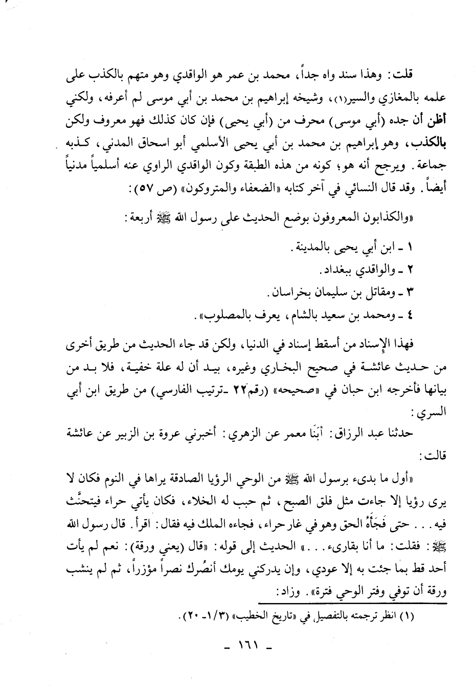 قلت: وهذا سند واه جدا، محمد بن عمر هو الواقدي وهو متهم بالكذب على علمه بالمغازي والسير (1) ، وشيخه إبراهيم بن محمد بن أبي موسى لم أعرفه، ولكني أظن أن جده أبي موسى محرف من أبي يحيى، فإن كان كذلك فهو معروف ولكن بالكذب، وهو إبراهيم بن محمد بن أبي يحيى الأسلمي أبو إسحاق المدني، كذبه جماعة.