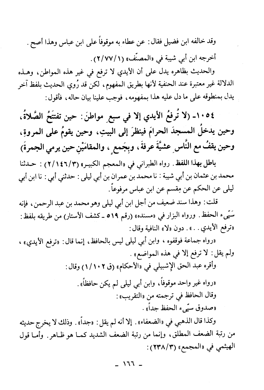 1054 - " لا ترفع الأيدي إلا في سبع مواطن: حين تفتتح الصلاة، وحين يدخل المسجد الحرام فينظر إلى البيت، وحين يقوم على المروة، وحين يقف مع الناس عشية عرفة، وبجمع، والمقامين حين يرمي الجمرة ".