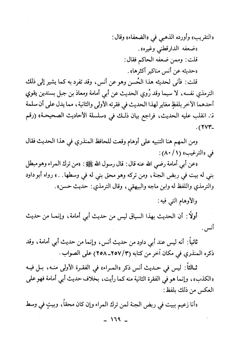 ثالثا: ليس في حديث أنس ذكر " المراء " في الفقرة الأولى منه، بل فيه " الكذب "، وإنما هو في الفقرة الثانية منه كما رأيت، بخلاف حديث أبي أمامة فهو على العكس من ذلك بلفظ: