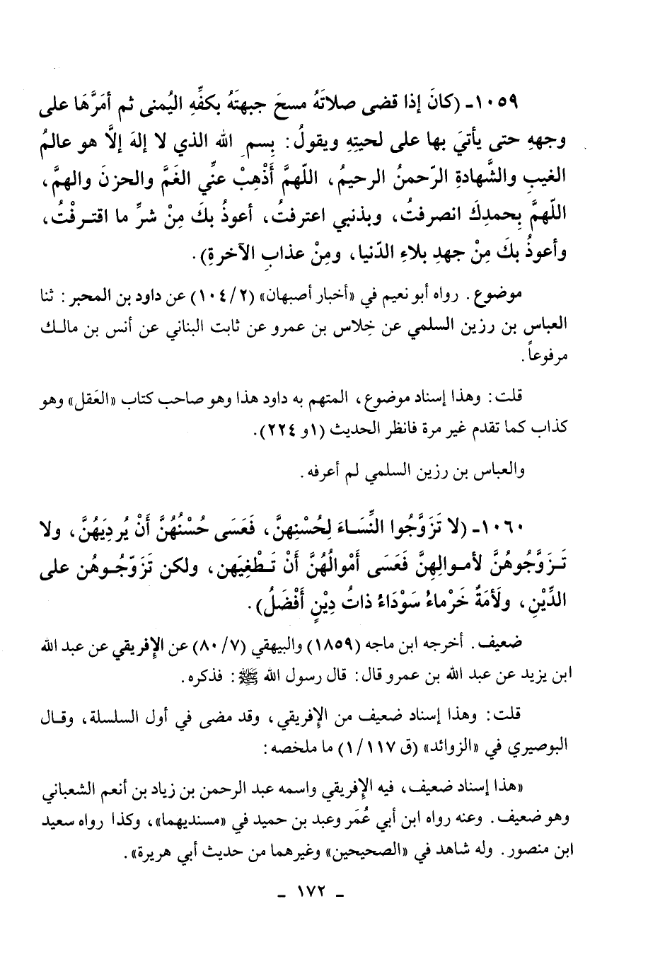 1059 - " كان إذا قضى صلاته مسح جبهته بكفه اليمنى ثم أمرها على وجهه حتى يأتي بها على لحيته ويقول: بسم الله الذي لا إله إلا هو عالم الغيب والشهادة الرحمن الرحيم، اللهم أذهب عني الغم والحزن والهم، اللهم بحمدك انصرفت، وبذنبي اعترفت، أعوذ لك من شر ما اقترفت، وأعوذ بك من جهد بلاء الدنيا، ومن عذاب الآخرة ".