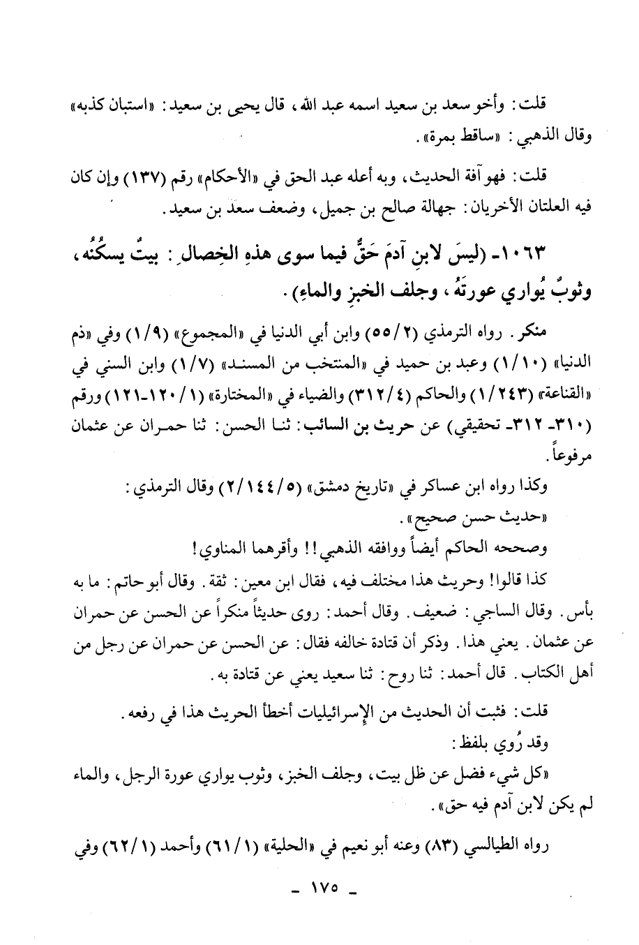 1063 - " ليس لابن آدم حق فيما سوى هذه الخصال: بيت يسكنه، وثوب يواري عورته، وجلف الخبز والماء ".