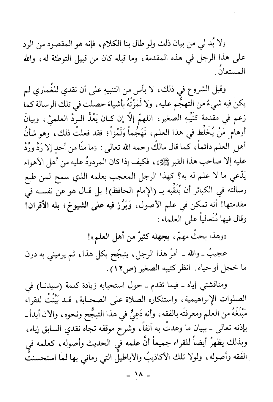 زعم في مقدمة كتَيِّبهِ الصغير، اللهمّ إلّا إن كان يَعُدُّ الردَّ العلميَّ، وبيانَ أوهامِ مَنْ يُخَلِّط في هذا العلم، تَهَجُّماً وَلَمْزاً. فقد فعلتُ ذلك، وهو شأنُ أهلِ العلم دائماً، كما قال مالكٌ رحمه الله تعالى: "ما منّا من أحدٍ إلا رَدَّ ورُدَّ عليه إلا صاحب هذا القبر- صلى الله عليه وسلم – "، فكيف إذا كان المردودُ عليه من أهل الأهواء يَدّعي ما لا علم له به؟ كهذا الرجل المعجب بعلمه الذي سمح لمن طبع رسالته في الكبائر أن يُلَقِّبه ب (الِإمام الحافظ) ! بل قال هو عن نفسه في مقدمتها! أنه تمكن في علم الأصول، وَبَرَّز فيه على الشيوخ؛ بله الأقران!