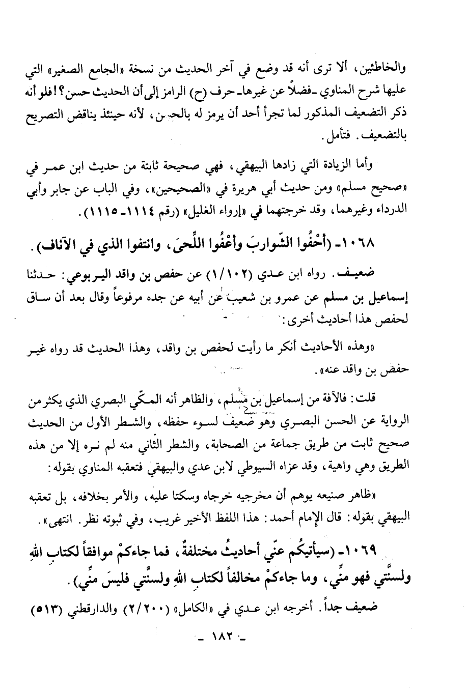 والخاطئين، ألا ترى أنه قد وضع في آخر الحديث من نسخة " الجامع الصغير " التي عليها شرح المناوي، فضلا عن غيرها حرف (ح) الرامز إلى أن الحديث حسن؟ ! فلو أنه ذكر التضعيف المذكور لما تجرأ أحد أن يرمز له بالحسن، لأنه حينئذ يناقض التصريح بالتضعيف، فتأمل.