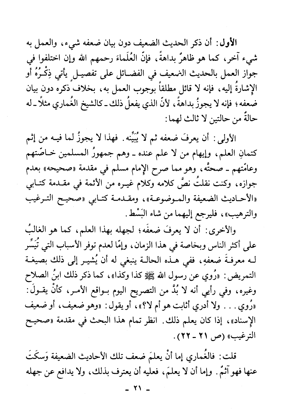 والأخرى: أن لا يعرفَ ضعفَه؛ لجهله بهذا العلم، كما هو الغالبُ على أكثر الناس وبخاصة في هذا الزمان، وإمّا لعدم توفر الأسباب التي تُيَسِّر له معرفةَ ضعفهِ، ففي هذه الحالة ينبغي له أن يُشير إلى ذلك بصيغة التمريض: "رُوي عن رسول الله – صلى الله عليه وسلم - كذا وكذا"، كما ذكر ذلك ابن الصلاح وغيره، وفي رأي أنه لا بُدَّ من التصريح اليوم بواقع الأمر، كأن يقولَ: