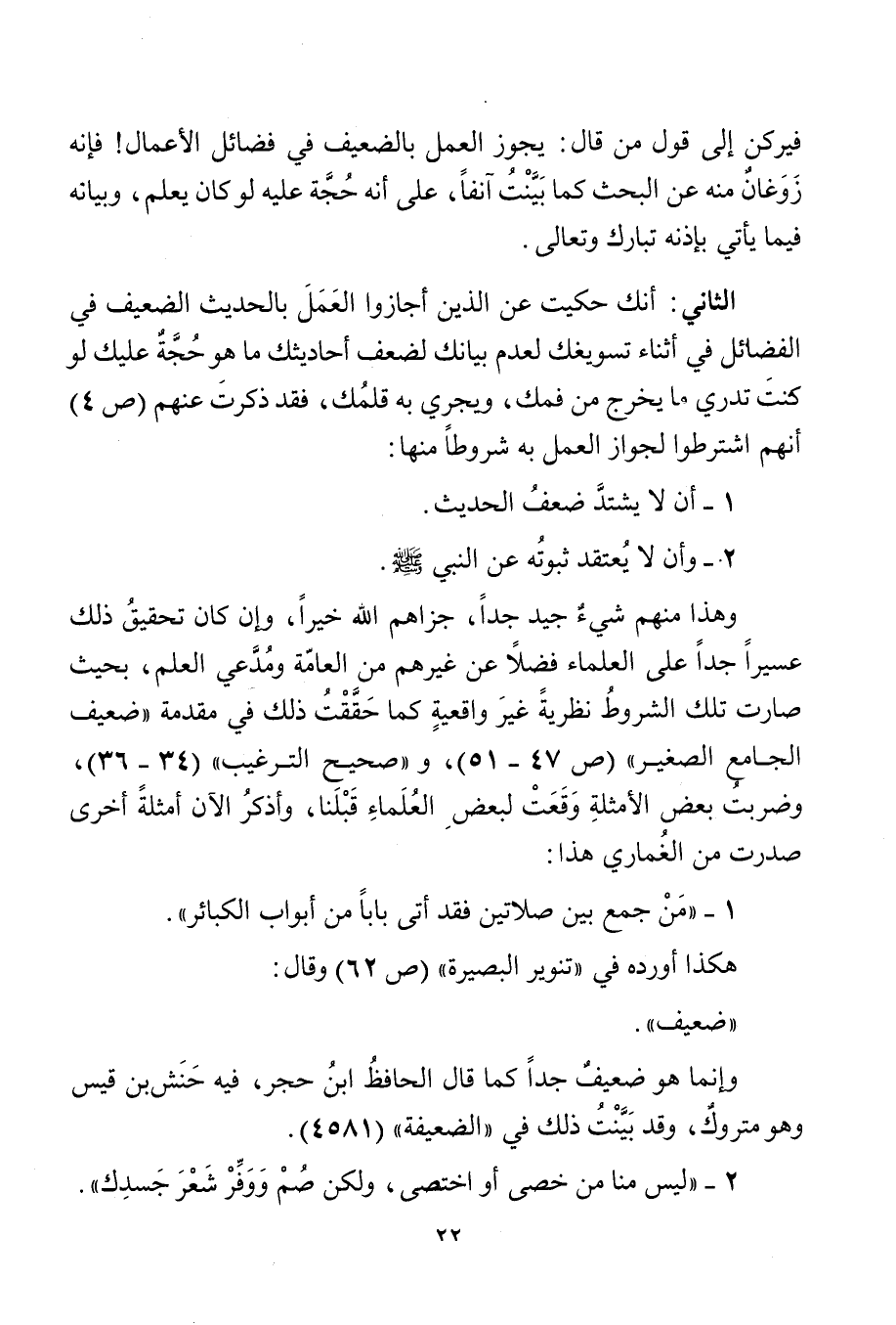 الثاني: أنك حكيت عن الذين أجازوا العَمَلَ بالحديث الضعيف في الفضائل في أثناء تسويغك لعدم بيانك لضعف أحاديثك ما هو حُجَّةٌ عليك لو