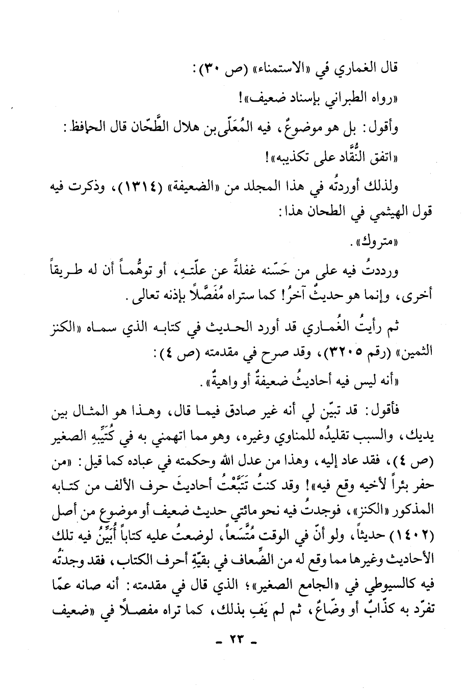 فأقول: قد تبيّن لي أنه غير صادق فيما قال، وهذا هو المثال بين يديك، والسبب تقليدُه للمناوي وغيره، وهو مما اتهمني به في كُتَيِّبهِ الصغير (ص 4) ، فقد عاد إليه، وهذا من عدل الله وحكمته في عباده كما قيل: "من حفر بئراً لأخيه وقع فيه "! وقد كنتُ تَتَبَّعْتُ أحاديثَ حرف الألف من كتابه المذكور " الكنز"، فوجدتُ فيه نحو مائتي حديث ضعيف أو موضوع من أصل (1402) حديثاً، ولو أنّ في الوقت مُتَسَعاً، لوضعتُ عليه كتاباً أُبَيِّنُ فيه تلك الأحاديث وغيرها مما وقع له من الضِّعاف في بقيّةِ أحرف الكتاب، فقد وجدته فيه كالسيوطي في "الجامع الصغير"، الذي قال في مقدمته: أنه صأنه عمّا تفرد به كذّابٌ أو وضّاعٌ، ثم لم يَفِ بذلك، كما تراه مفصلاً في "ضعيف