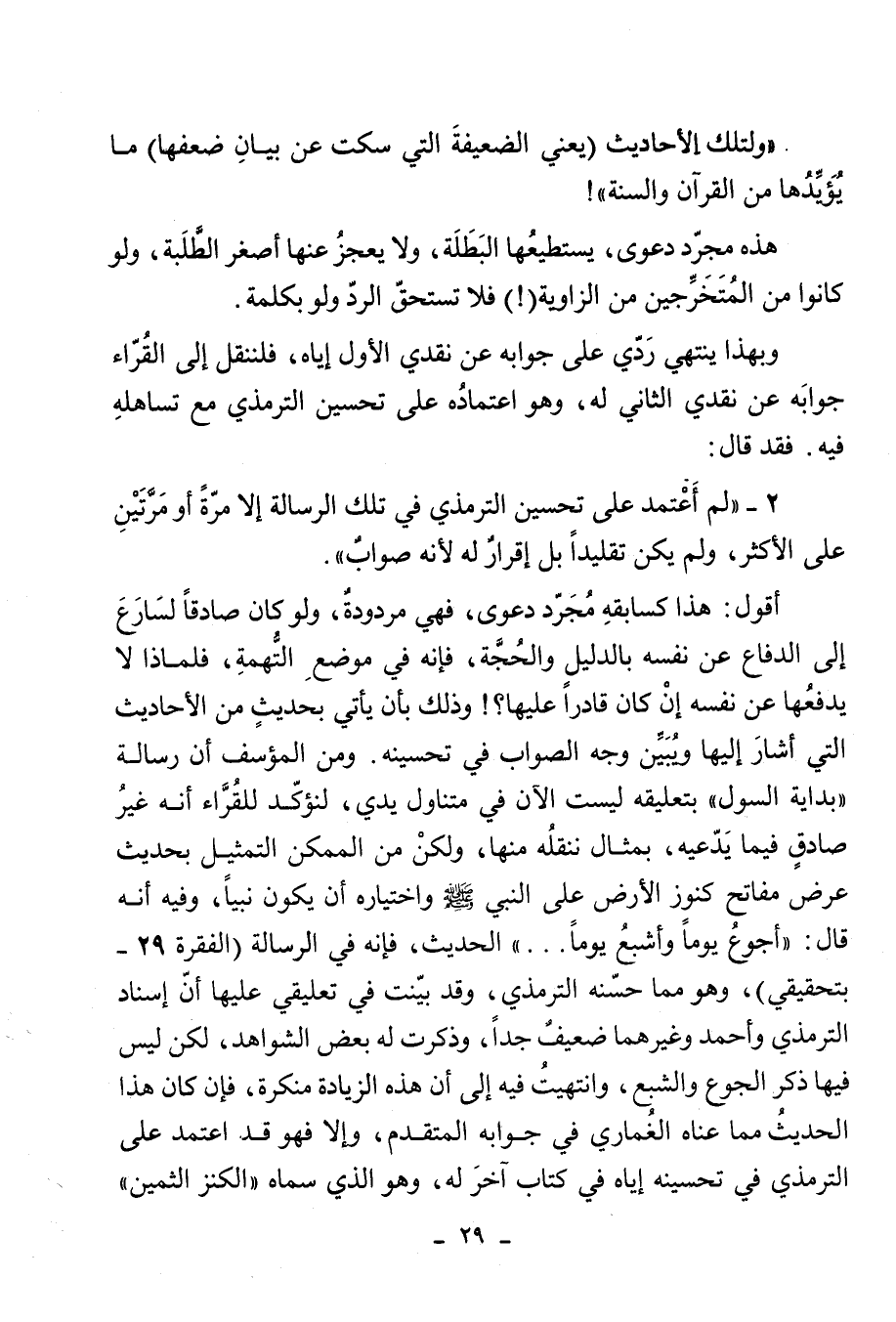 2- "لم أَعْتمد على تحسين الترمذي في تلك الرسالة إلا مؤَّةً أو مَرتَيْنِ على الأكثر، ولم يكن تقليداً بل إقرارٌ له لأنه صوابٌ ".
