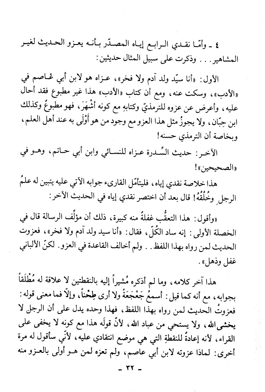 "وأقول: هذا التعقُّب غفلةٌ منه كبيرة، ذلك أن مؤلَف الرسالة قال في الخصلة الأولى: إنه ساد الكُلّ، فقال: "أنا سيد ولد آدم ولا فخر"، فعزوت