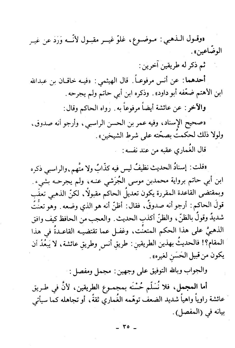 وبمقتضى القاعدة المقررة يكون تعديل الحاكم مقبولًا، لكن الذهبي تعقّب قولَ الحاكم: أرجو أنه صدوقٌ، فقال: أظن أنه هو الذي وضعه. وهو تعنُّت شديدٌ وقولٌ بالظنّ، والظن أكذب الحديث. والعجب من الحافظ كيف وافق الذهبيَّ على هذا الحكم المتعنِّت، وغفل عما تقتضيه القاعدةُ في هذا المقام؟! فالحديثُ بهذين الطريقينِ: طريقِ أنسٍ وطريقِ عائشة، لا يَبعُد أن يكون من قبيل الحَسَنِ لغيره ".