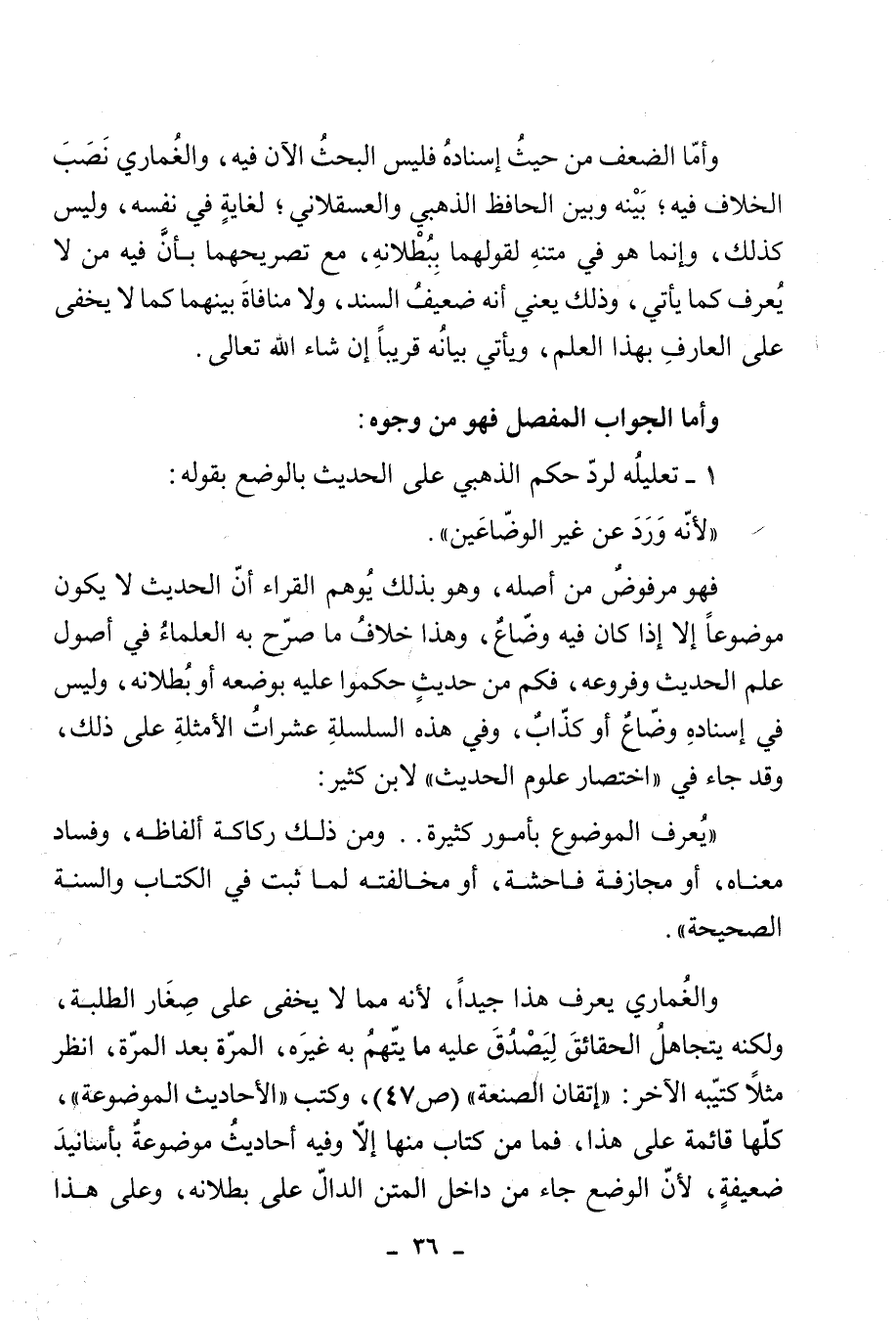 والغُماري يعرف هذا جيداً، لأنه مما لا يخفى على صِغَار الطلبة، ولكنه يتجاهلُ الحقائقَ لِيَصْدُقَ عليه ما يتّهمُ به غيرَه، المرّة بعد المرّة، انظر مثلاً كتيّبه الآخر: "إتقان الصنعة" (ص 47) ، وكتب " الأحاديث الموضوعة"، كلها قائمة على هذا، فما من كتاب منها إلا وفيه أحاديثُ موضوعةٌ بأسانيدَ ضعيفةٍ، لأنّ الوضع جاء من داخل المتن الدالّ على بطلأنه، وعلى هذا
