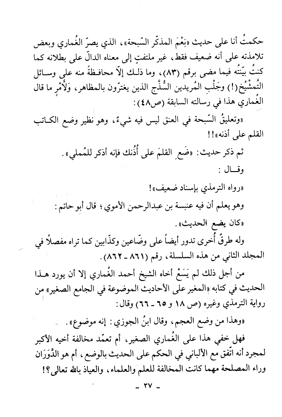 حكمت أنا على حديث "نِعْمَ المذكّر السّبحة"، الذي يصرّ الغُماري وبعض تلامذته على أنه ضعيف فقظ، غير ملتفتٍ إلى معناه الدالّ على بطلأنه كما كنتُ بيّنتُه فيما مضى برقم (83) ، وما ذلك إلّا محافظةً منه على وسائل التَّمشْيُخ (!) وجَلْبِ المُريدين السُّذَّج الذين يغترّون بالمظاهر، وَلأمْرٍ ما قال الغُماري هذا في رسالته السابقة (ص 48) :