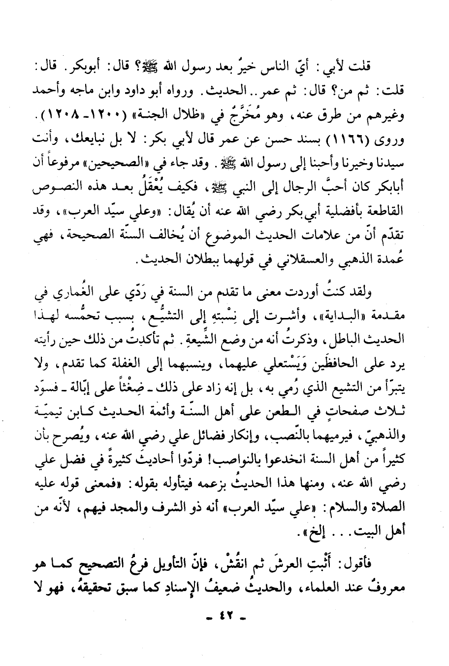 وروي (1166) بسند حسن عن عمر قال لأبي بكر: لا بل نبايعك، وأنت سيدنا وخيرنا وأحبنا إلى رسول الله - صلى الله عليه وسلم -؛ وقد جاء في "الصحيحين " مرفوعاً أن أبا بكر كان أحبَّ الرجال إلى النبي - صلى الله عليه وسلم - فكيف يُعْقَلُ بعد هذه النصوص القاطعة بأفضلية أبي بكر رضي الله عنه أن يُقال: "وعلي سيّد العرب "، وقد تقدّم أنّ من علامات الحديث الموضوع أن يُخالف السنّة الصحيحة، فهي عمدة الذهبي والعسقلاني في قولهما ببطلان الحديث.