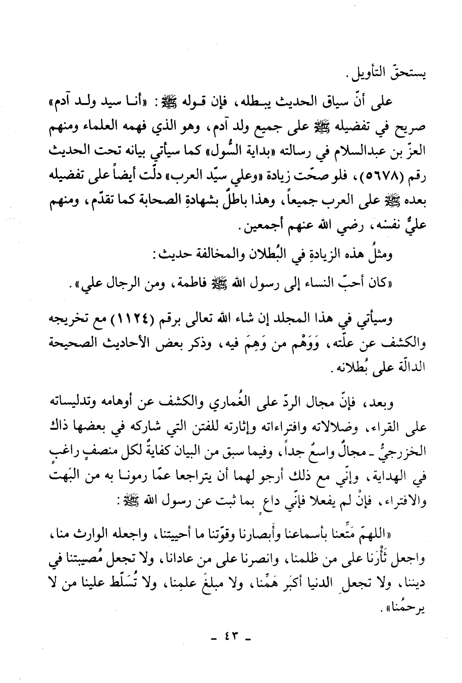 على أنّ سياق الحديث يبطله، فإن قوله- صلى الله عليه وسلم -: "أنا سيد ولد آدم " صريح في تفضيله - صلى الله عليه وسلم -على جميع ولد آدم، وهو الذي فهمه العلماء ومنهم العزّ بن عبد السلام في رسالته "بداية السُّول " كما سيأتي بيأنه تحت الحديث رقم (5678) ، فلو صحّت زيادة "وعلي سيد العرب " دلَّت أيضاً على تفضيله بعده - صلى الله عليه وسلم -على العرب جميعاً، وهذا باطلٌ بشهادةِ الصحابة كما تقدم، ومنهم على نفسه، رضي الله عنهم أجمعين.