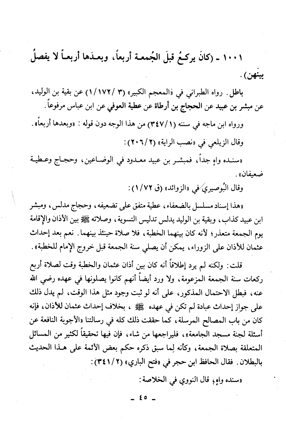 قلت: ولكنه لم يرد إطلاقا أنه كان بين أذان عثمان والخطبة وقت لصلاة أربع ركعات سنة الجمعة المزعومة، ولا ورد أيضا أنهم كانوا يصلونها في عهده رضي الله عنه، فبطل الاحتمال المذكور، على أنه لوثبت وجود مثل هذا الوقت، لم يدل ذلك على جواز إحداث عبادة لم تكن في عهده صلى الله عليه وسلم، بخلاف إحداث عثمان للأذان، فإنه كان من باب المصالح المرسلة، كما حققت ذلك كله في رسالتنا الأجوبة النافعة عن أسئلة لجنة مسجد الجامعة، فليراجعها من شاء، فإن فيها تحقيقا لكثير من المسائل المتعلقة بصلاة الجمعة، وكأنه لما سبق ذكره حكم بعض الأئمة على هذا الحديث بالبطلان، فقال الحافظ ابن حجر في " فتح الباري " (2/341) : سنده واه؛ قال النووي في الخلاصة: