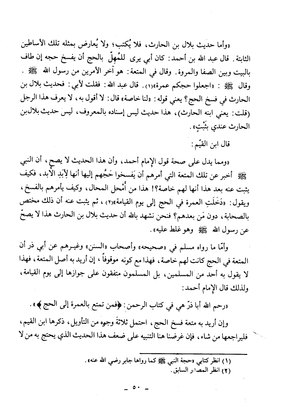 وأما حديث بلال بن الحارث، فلا يكتب؛ ولا يعارض بمثله تلك الأساطين الثابتة، قال عبد الله بن أحمد: كان أبي يرى للمهل بالحج أن يفسخ حجه إن طاف بالبيت وبين الصفا والمروة، وقال في المتعة: هو آخر الأمرين من رسول الله صلى الله عليه وسلم، وقال صلى الله عليه وسلم: " اجعلوا حجكم عمرة " (1) ، قال عبد الله: فقلت لأبي: فحديث بلال بن الحارث في فسخ الحج؟ يعني قوله: " لنا خاصة " قال: لا أقول به، لا يعرف هذا الرجل (قلت: يعني ابنه الحارث) ، هذا حديث ليس إسناده بالمعروف، ليس حديث بلال بن الحارث عندي بثبت.