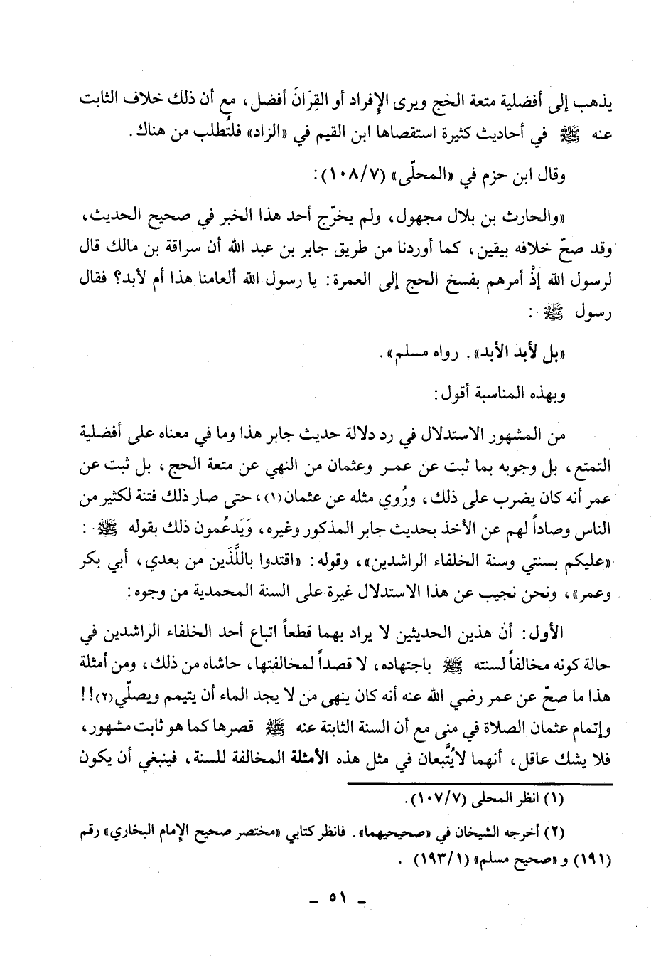 وبهذه المناسبة أقول: من المشهور الاستدلال في رد دلالة حديث جابر هذا وما في معناه على أفضلية التمتع، بل وجوبه بما ثبت عن عمر وعثمان من النهي عن متعة الحج، بل ثبت عن عمر أنه كان يضرب على ذلك، وروي مثله عن عثمان (1) ، حتى صار ذلك فتنة لكثير من الناس وصادا لهم عن الأخذ بحديث جابر المذكور وغيره، ويدعمون ذلك بقوله صلى الله عليه وسلم: " عليكم بسنتي وسنة الخلفاء الراشدين "، وقوله: " اقتدوا باللذين من بعدي، أبي بكر وعمر "، ونحن نجيب عن هذا الاستدلال غيرة على السنة المحمدية من وجوه: