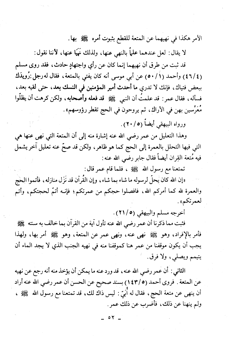 الثاني: أن عمر رضي الله عنه، قد ورد عنه ما يمكن أن يؤخذ منه أنه رجع عن نهيه عن المتعة، فروى أحمد (5/143) بند صحيح عن الحسن أن عمر رضي الله عنه أراد أن ينهى عن متعة الحج، فقال له أبي: ليس ذاك لك، قد تمتعنا مع رسول الله صلى الله عليه وسلم، ولم ينهنا عن ذلك، فأضرب عن ذلك عمر.