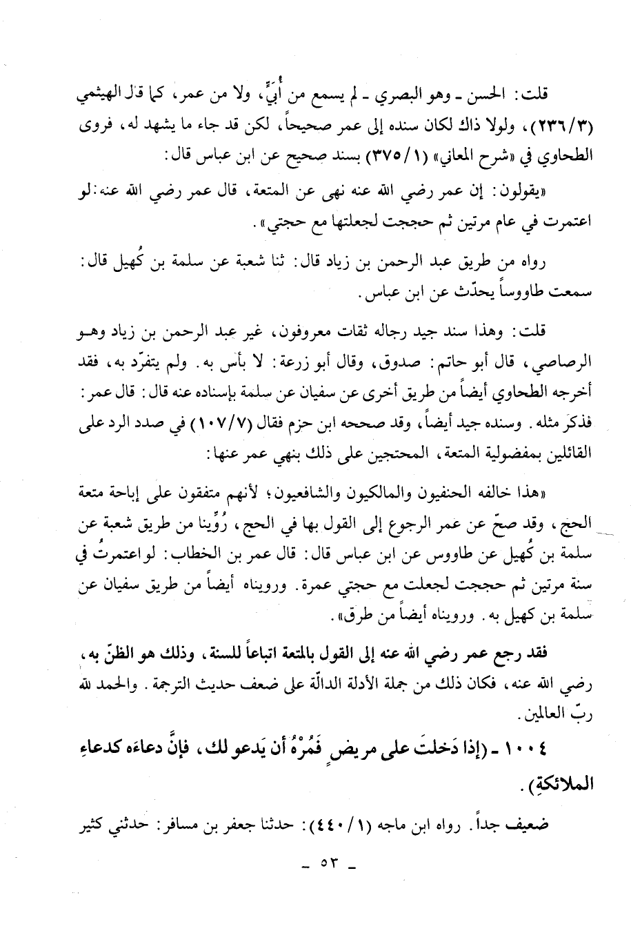كهيل به، ورويناه أيضا من طرق، فقد رجع عمر رضي الله عنه إلى القول بالمتعة اتباعا للسنة، وذلك هو الظن به، رضي الله عنه، فكان ذلك من جملة الأدلة الدالة على ضعف حديث الترجمة، والحمد لله رب العالمين.