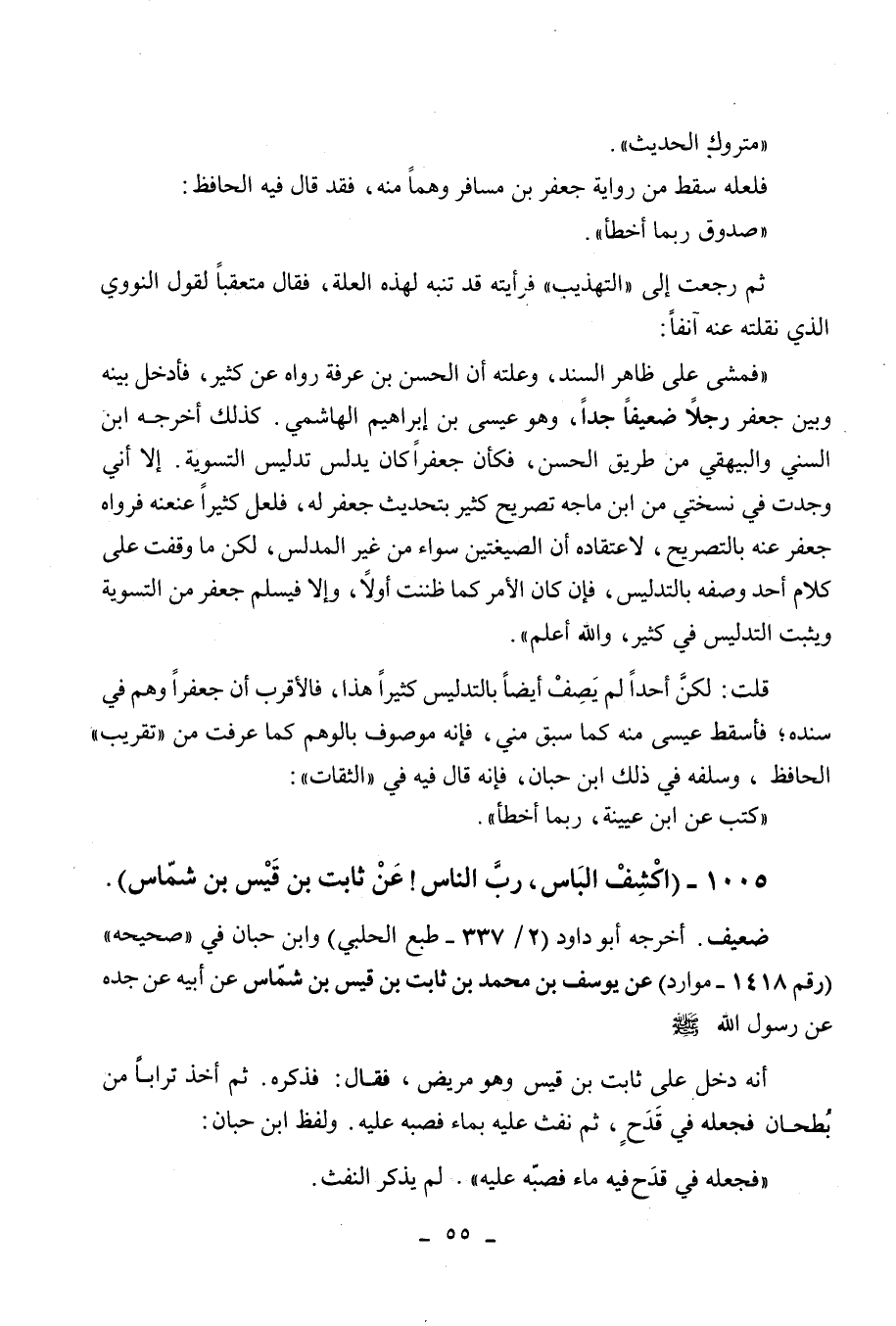 قلت: لكن أحدا لم يصف أيضا بالتدليس كثيرا هذا، فالأقرب أن جعفرا وهم في سنده؛ فأسقط عيسى منه كما سبق مني، فإنه موصوف بالوهم كما عرفت من " تقريب " الحافظ، وسلفه في ذلك ابن حبان، فإنه قال فيه في " الثقات ":