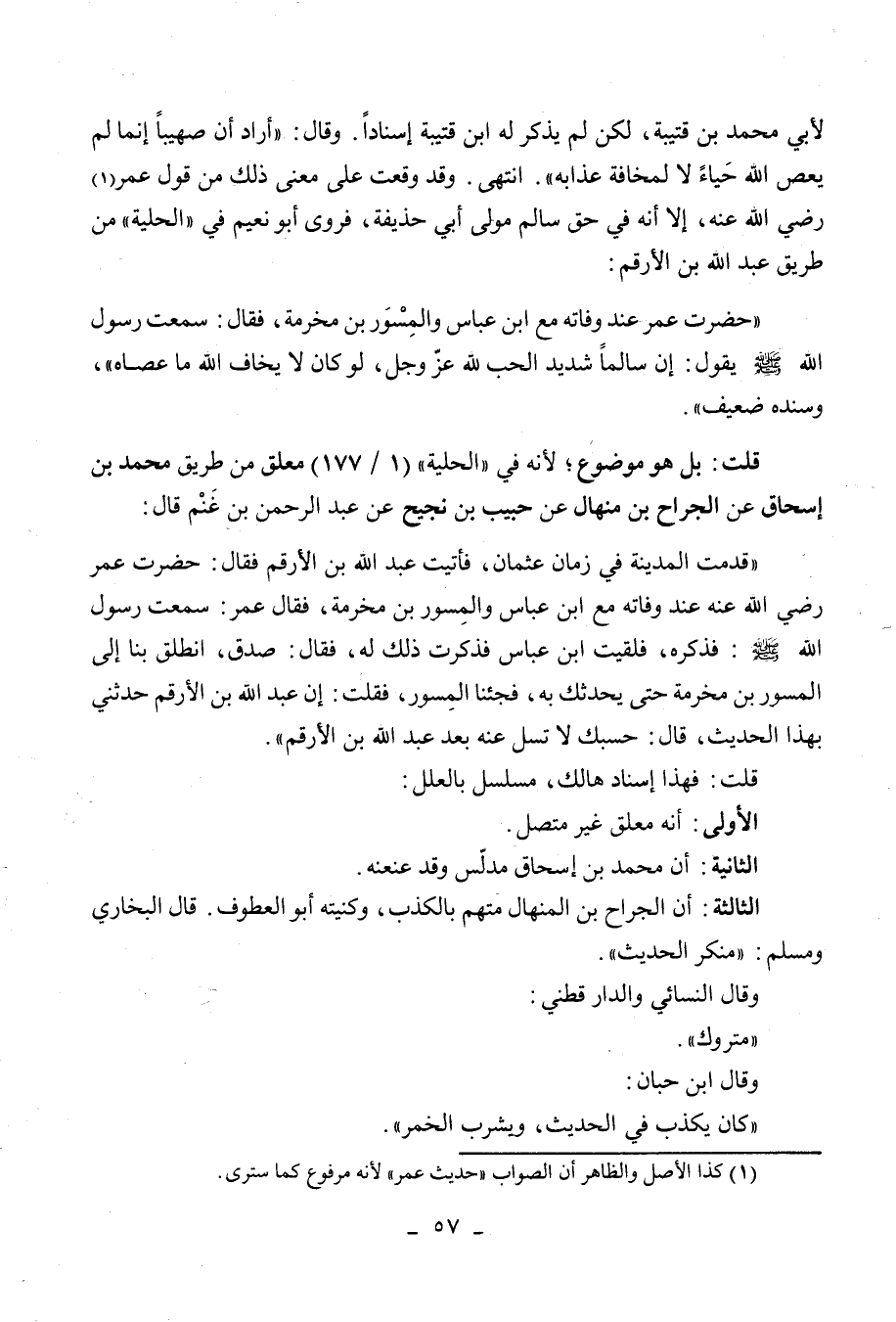 قدمت المدينة في زمان عثمان، فأتيت عبد الله بن الأرقم فقال: حضرت عمر رضي الله عنه عند وفاته مع ابن عباس والمسور بن مخرمة، فقال عمر: سمعت رسول الله صلى الله عليه وسلم: فذكره، فلقيت ابن عباس فذكرت ذلك له، فقال: صدق، انطلق بنا إلى المسور بن مخرمة حتى يحدثك به، فجئنا المسور، فقلت: إن عبد الله بن الأرقم حدثني بهذا الحديث، قال: حسبك لا تسل عنه بعد عبد الله بن الأرقم.