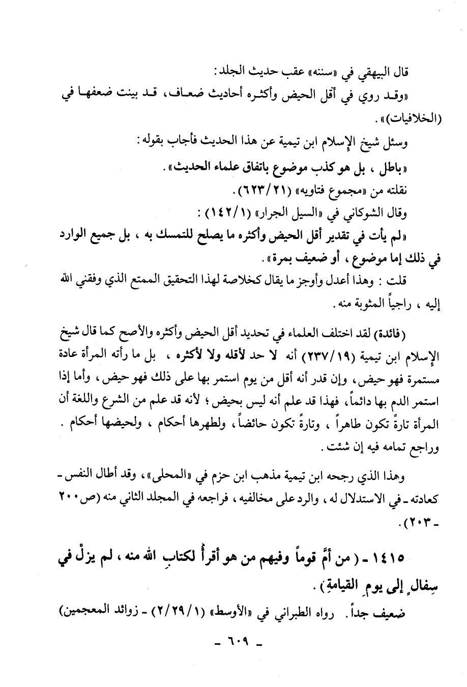 " وقد روي في أقل الحيض وأكثره أحاديث ضعاف، قد بينت ضعفها في (الخلافيات) ".