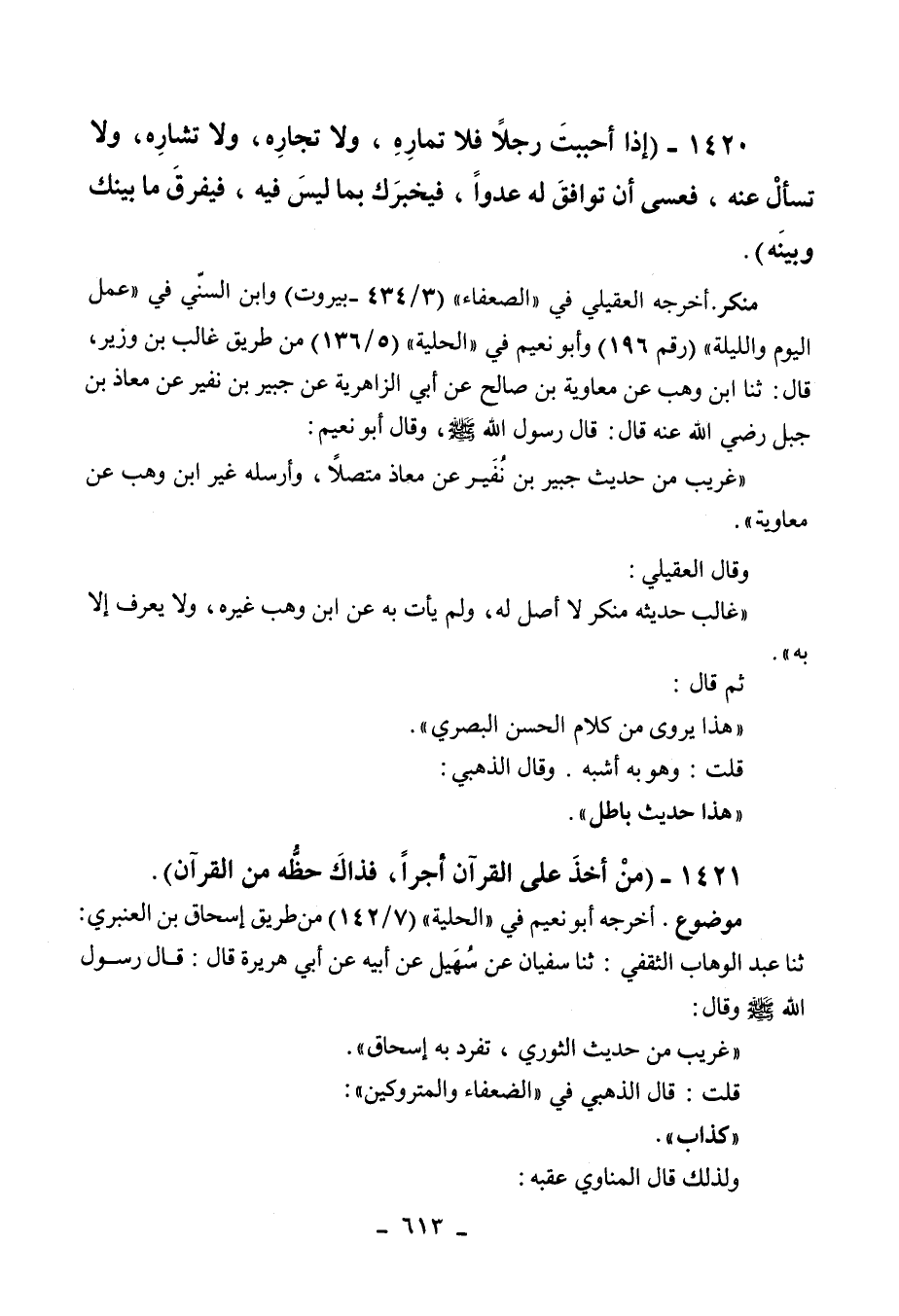 1420 - " إذا أحببت رجلا فلا تماره، ولا تجاره، ولا تشاره، ولا تسأل عنه، فعسى