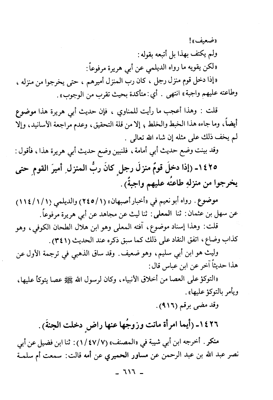 1425 - " إذا دخل قوم منزل رجل كان رب المنزل أمير القوم حتى يخرجوا من منزله طاعته