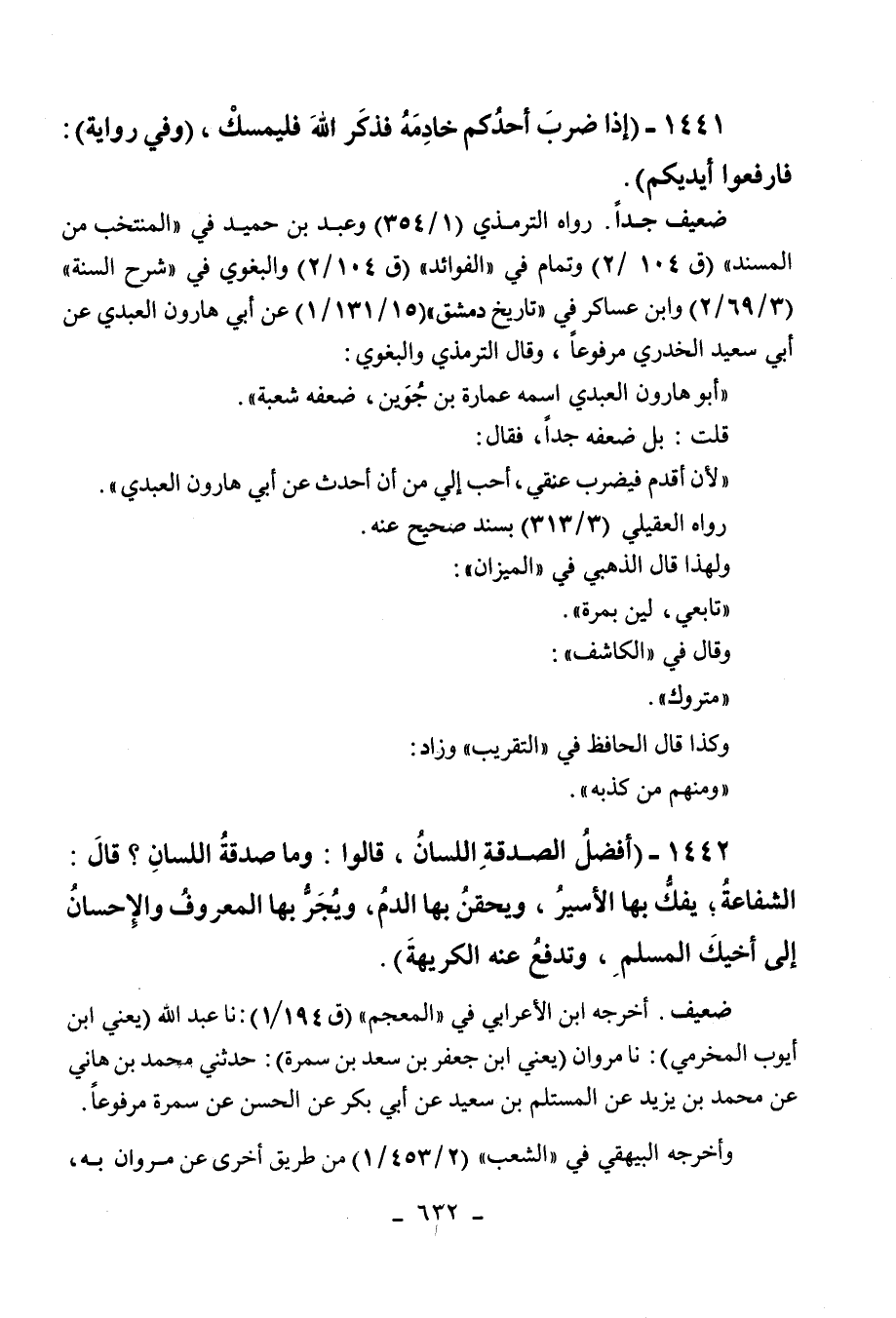 1442 - " أفضل الصدقة اللسان، قالوا: وما صدقة اللسان؟ قال: الشفاعة؛ يفك بها