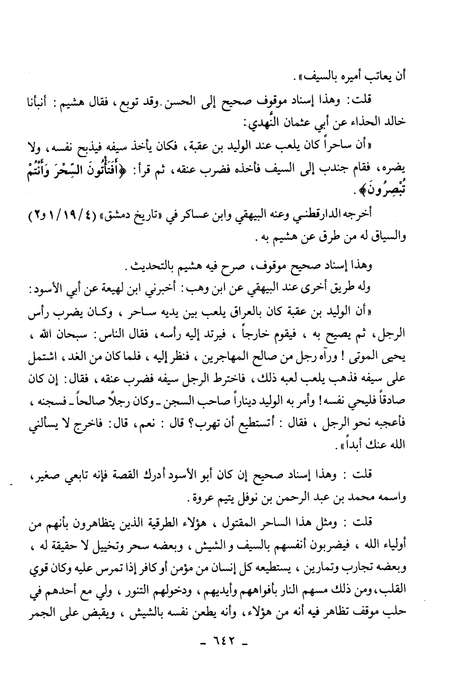 " أن ساحرا كان يلعب عند الوليد بن عقبة، فكان يأخذ سيفه فيذبح نفسه، ولا
