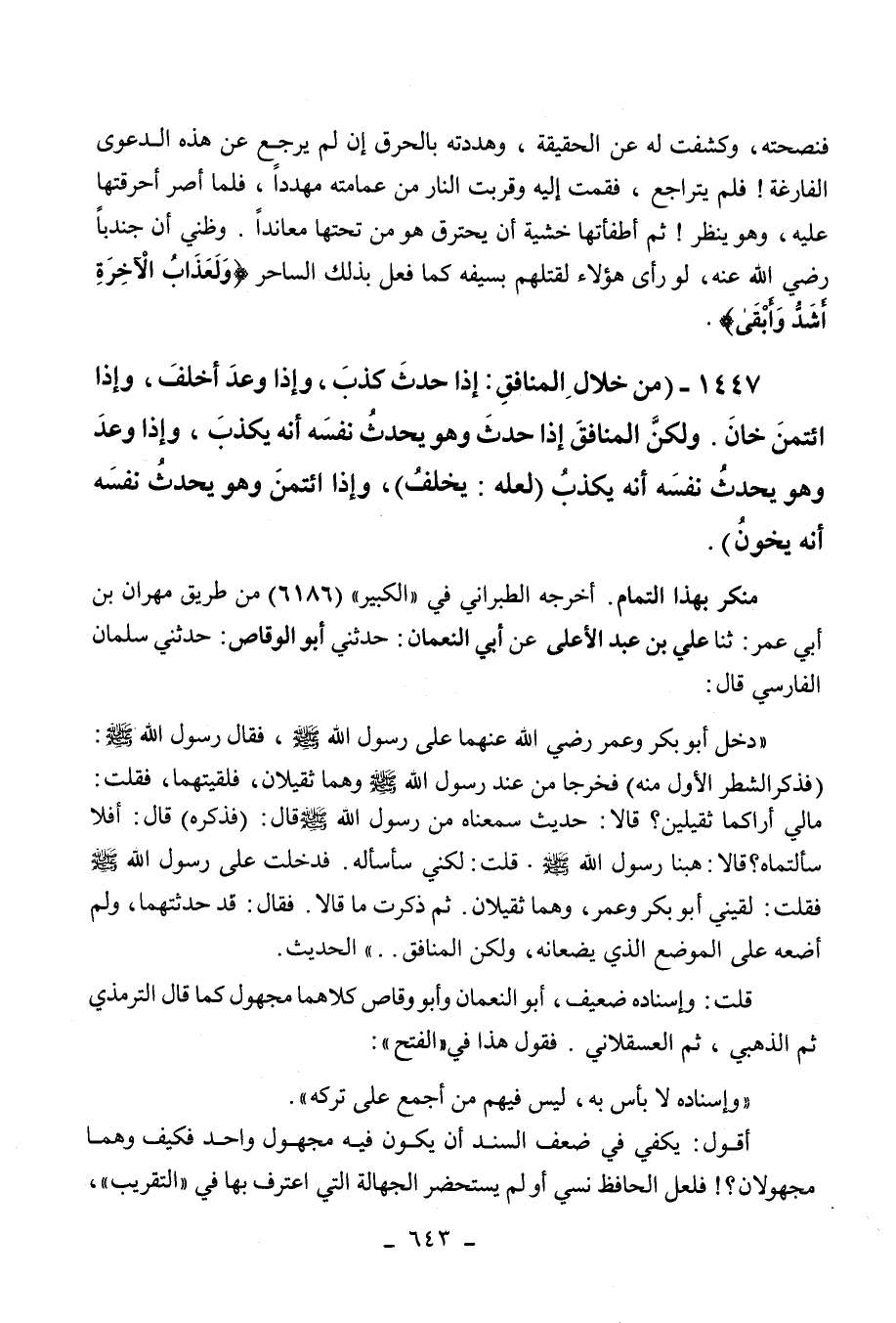 1447 - " من خلال المنافق: إذا حدث كذب، وإذا وعد أخلف، وإذا ائتمن خان. ولكن
