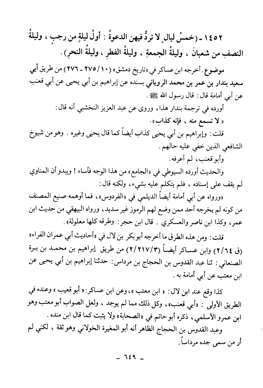 1452 - " خمس ليال لا ترد فيهن الدعوة: اول ليلة من رجل، وليلة النصف من شعبان،
