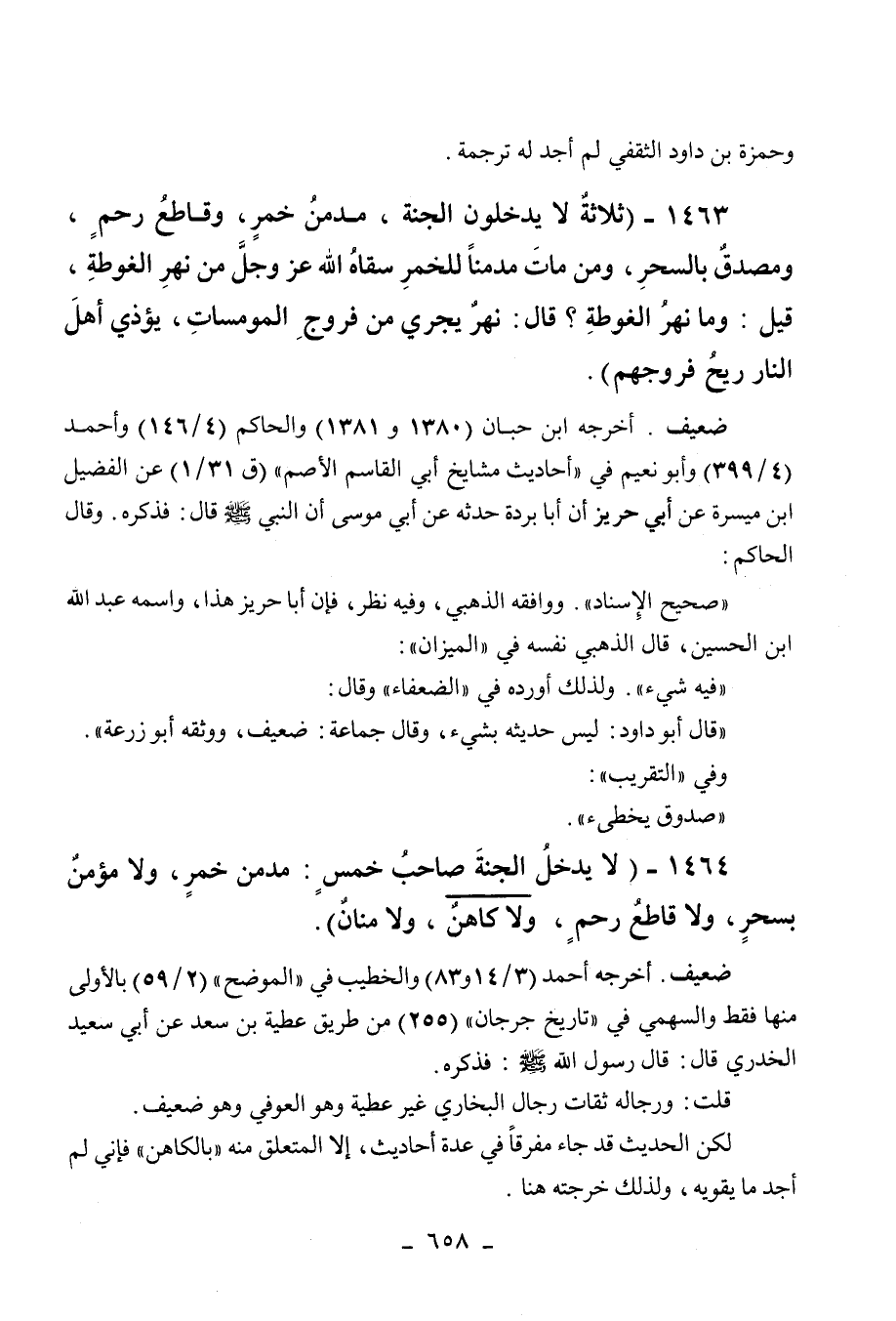 1463 - " ثلاثة لا يدخلون الجنة، مدمن خمر، وقاطع رحم، ومصدق بالسحر، ومن مات