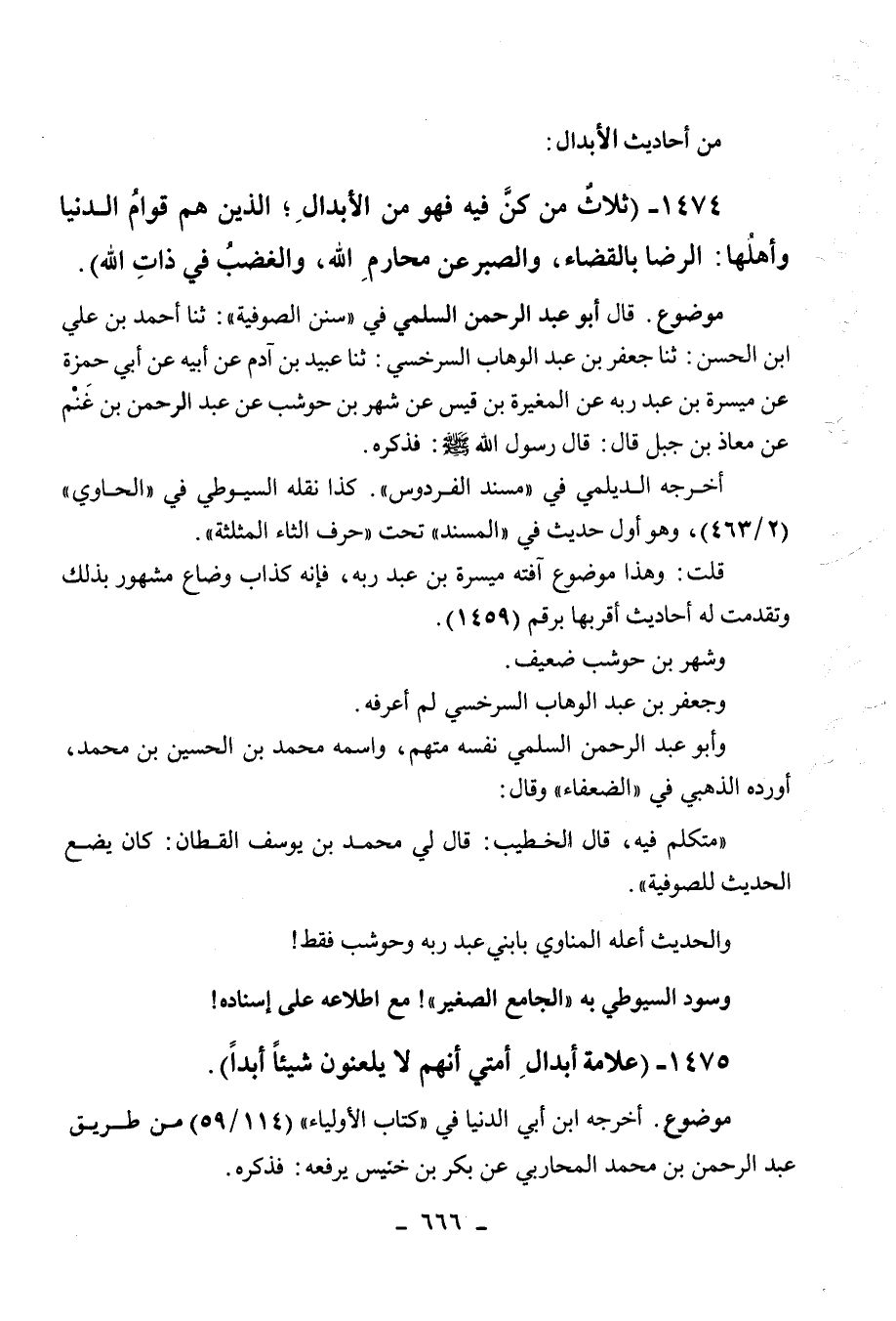 1474 - " ثلاث من كن فيه فهو من الأبدال؛ الذين هم قوام الدنيا وأهلها: الرضا