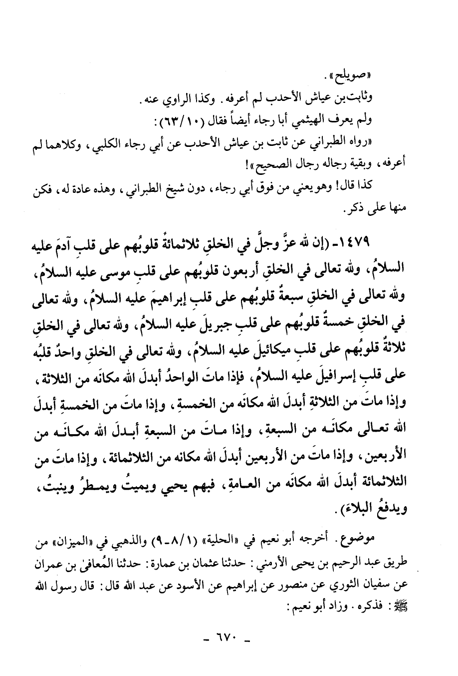 1479 - " إن لله عز وجل في الخلق ثلاثمائة قلوبهم على قلب آدم عليه السلام، ولله