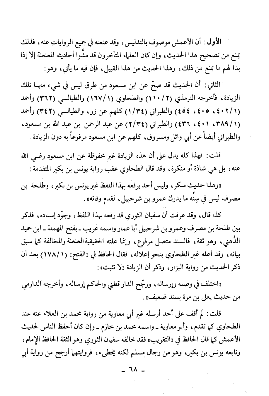كذا قال، وقد عرفت أن سفيان الثوري قد رفعه بهذا اللفظ، وجود إسناده، فذكر بين طلحة بن مصرف وعمرو بن شرحبيل أبا عمار واسمه عريب - بفتح المهملة - ابن حميد الدهني، وهو ثقة، فالسند متصل مرفوع، وإنما علته الحقيقية العنعنة والمخالفة كما سبق بيانه، وقد أعله غير الطحاوي بنحوإعلاله، فقال الحافظ في " الفتح " (1/178) بعد أن ذكر الحديث من رواية البزار، وذكر أن الزيادة لا تثبت: اختلف في وصله وإرساله، ورجح الدارقطني والحاكم إرساله، وأخرجه الدارمي من حديث يعلى بن مرة بسند ضعيف.